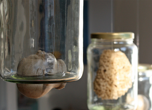 100 Konservengläser mit Fundstücken an Nylonfäden